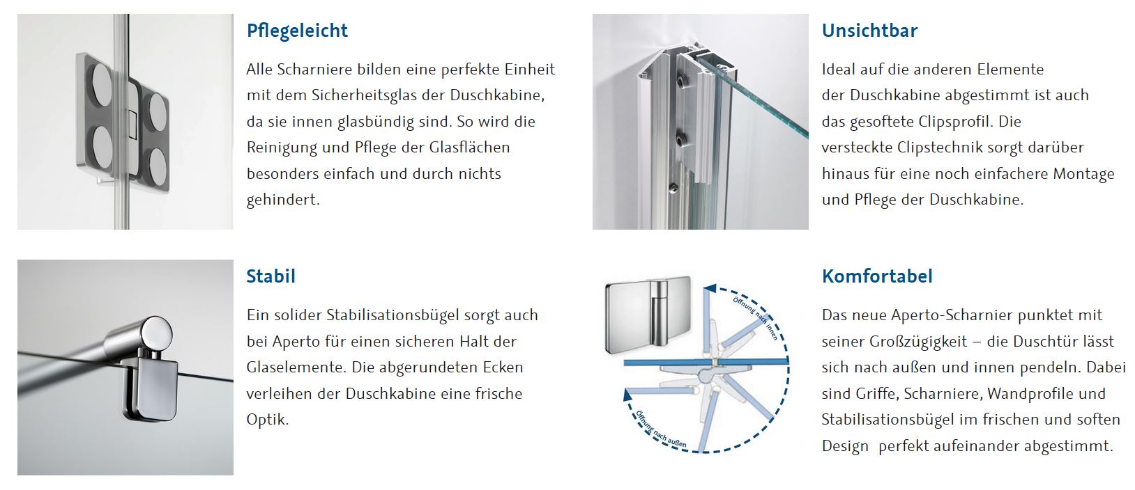 Das weit pendelbare Aperto-Scharnier ermöglicht einen komfortablen Zugang zur Duschkabine. Die Türen lassen sich grosszügig nach innen und aussen öffnen.