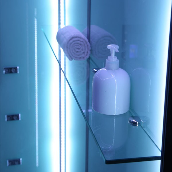 Zusätzlich befinden sich einstellbare Hydro-Massagedüsen in der Kabine. Diese lockern die Muskulatur auf und sorgen für eine unvergleichbare Entspannung. Das integrierte Farblicht bietet zusätzlich eine sogenannte Farblichttherapie. Je nach Farbauswahl wirkt es stimmungsaufhellend, beruhigend oder anregend.