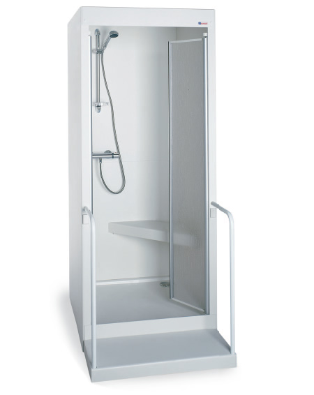 Die GRMB-Fertigdusche SENIOR ist mit der neuen eloxierten Kunstglas-Flügeltür ausgestattet.